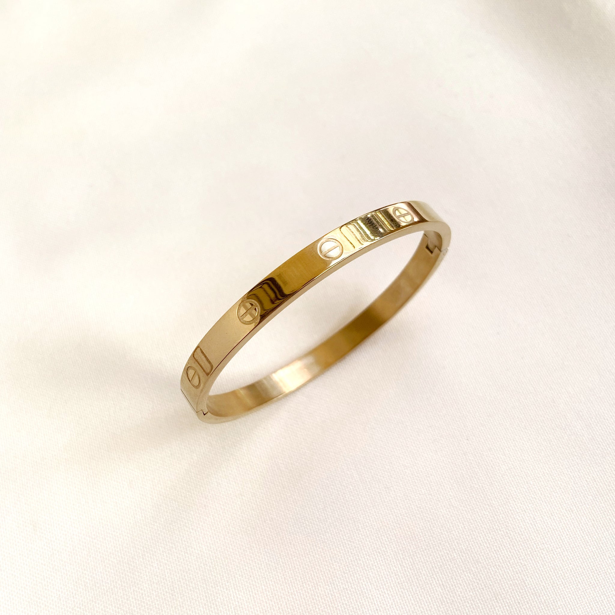 Pulsera dorada con círculos grabados.